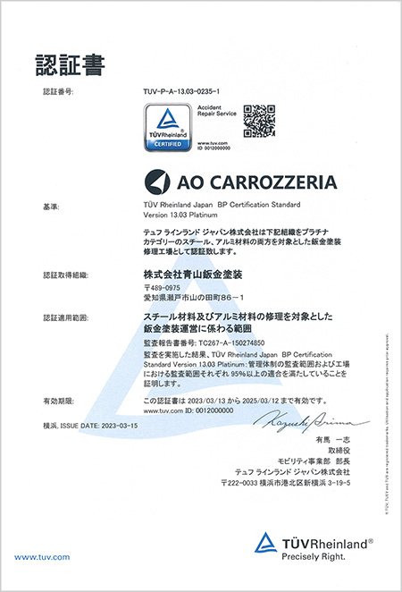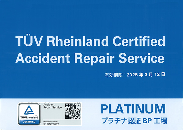 TUV(テュフ)認証とは、自動車修理を行う環境・設備の保有、修理品質の社内管理体制の確立、修理技術者への継続的なトレーニング技術に対してその安全性や機能の有効性などが認められたことを認証するものになります。